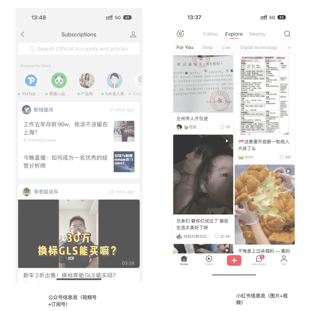 对比小红书的广场信息流对比公众号的信息流,小红书的浏览效率更加高效,在现在碎片化信息的消费习惯,小红书博主更能容易得到流量。