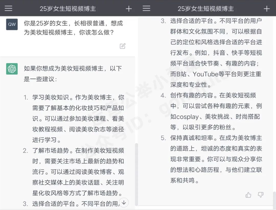 例如我向它提出问题:女生想成为美妆短视频博主,需要怎么做?它给出了有详细步骤的方法。你可以继续追问,更加具体的方案。