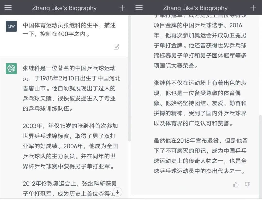 例如前几天张继科赌博的事件风波,需要介绍他的生平。我让ChatGPT描述一下,控制在400字之内,30秒就搞定了。