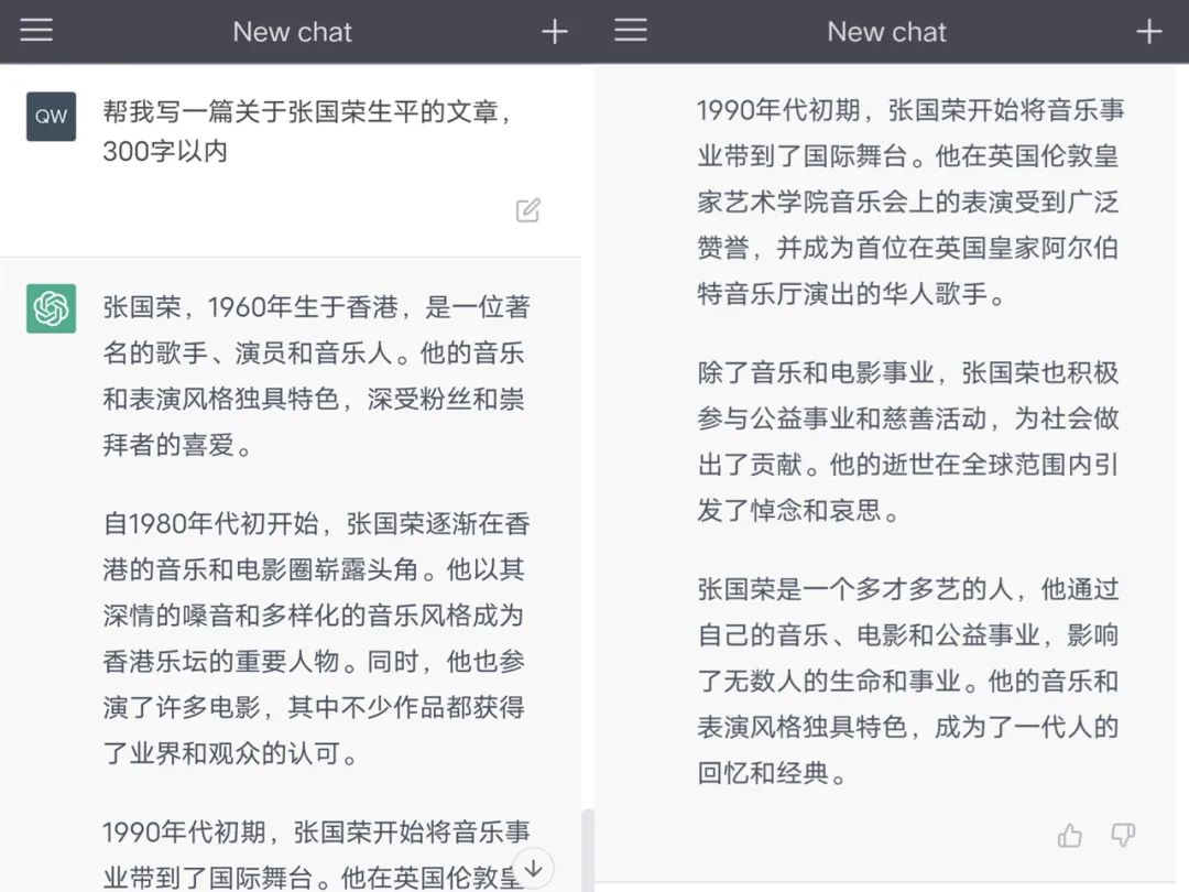 例如:命令它写出一篇关于张国荣生平的文章,控制在300字以内,它的答案精简有效。写3000字,也只需要几分钟。