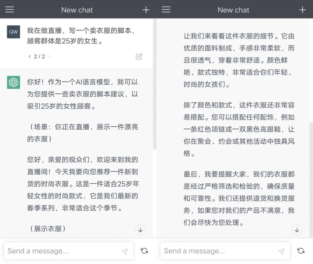 例如你要做直播带货,没经验,让它帮你写直播时的脚本文案,多少字都可以,它竟然还给出了场景脚本,太人性化了。