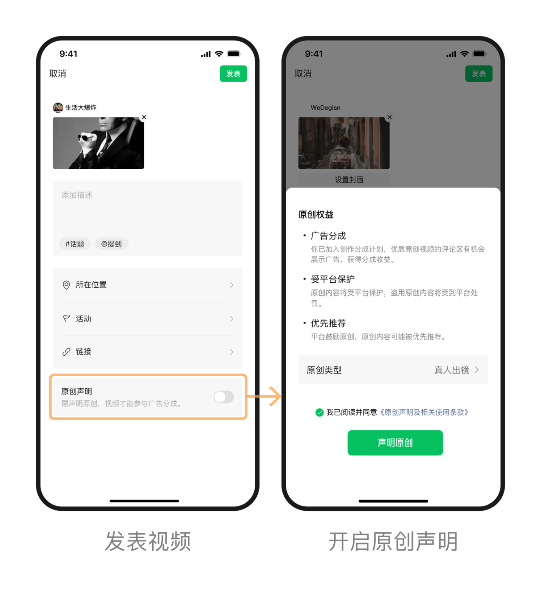 加入创作分成计划后,创作者只需在发表视频时开启「原创声明」,无需其他额外操作,视频评论区下方即有机会展示广告。