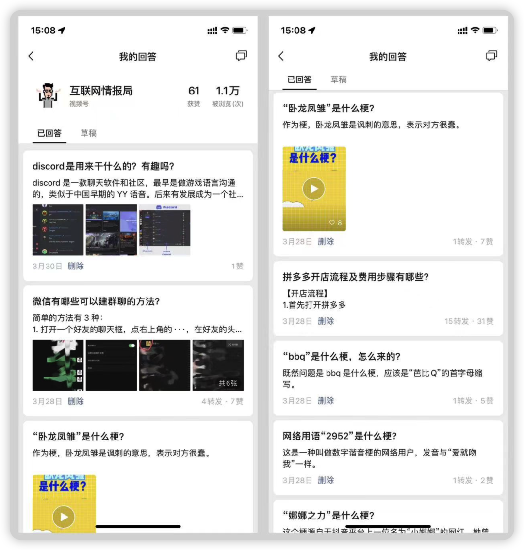 我试着用不同的方式回答了几个问题:1)直接从百度复制粘贴的;2)搬运二剪视频发在视频号引用进来;3)原创打字、作图回答。